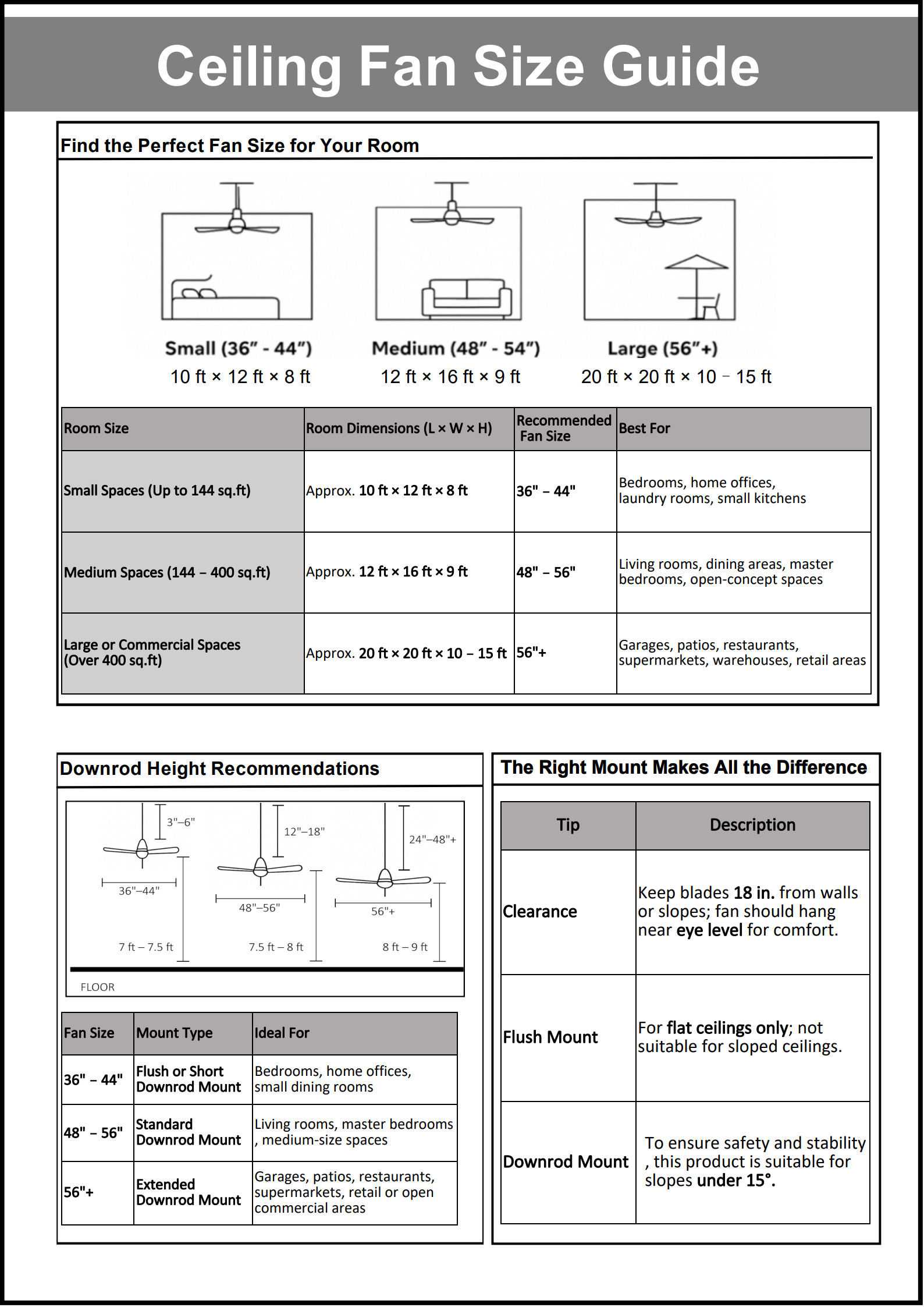 • 52" Solid Wood Flush Mount Ceiling Fan (No Light) Premium 52 inch ceiling fan with solid wood blades and durable metal components. Flush mount design, not suitable for sloped ceilings. Ideal for 15 ft × 15 ft bedrooms, living rooms, or other medium-sized spaces.